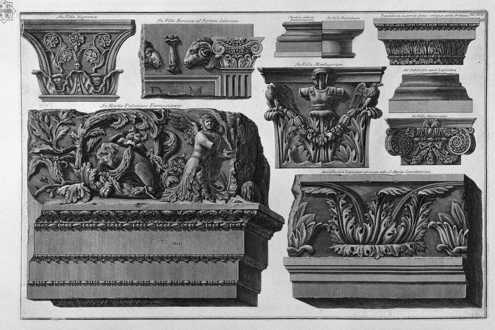 Ti offriamo una riproduzione artigianale su tela dell'opera famosa 'Capitelli e fregi (Farnese Giardini, ville romane)' di Giovanni Battista Piranesi, dal Museo delle Riproduzioni.
