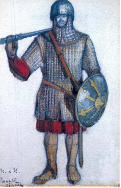 Ti offriamo una riproduzione artigianale su tela dell'opera famosa 'Cavaliere dell'entourage' di Nicholas Roerich, dal Museo delle Riproduzioni.