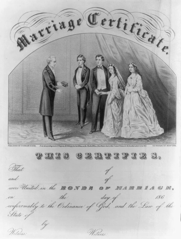 Ti offriamo una riproduzione artigianale su tela dell'opera famosa 'Certificato di matrimonio' di Currier and Ives, dal Museo delle Riproduzioni.