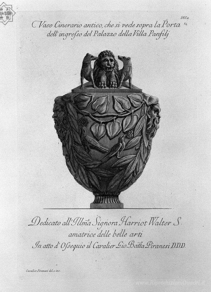 Ti offriamo una riproduzione artigianale su tela dell'opera famosa 'Cineraria vaso si vede sopra la porta d'ingresso del Palazzo del' di Giovanni Battista Piranesi, dal Museo delle Riproduzioni.