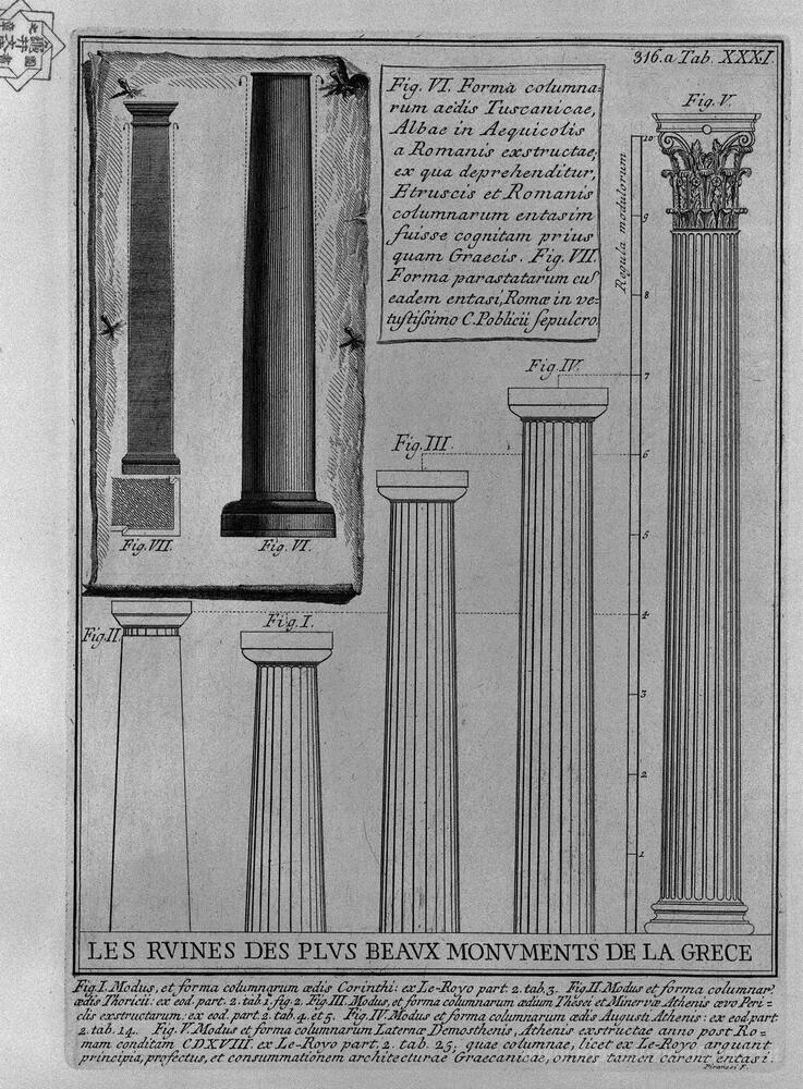 Scopri l'incanto senza tempo del dipinto Colonne doriche, Corinto e toscana (da Le Roy), realizzato dal celebre artista italiano Giovanni Battista Piranesi. Maestro dell'incisione e della pittura, Piranesi è rinomato per la sua capacità di fondere architettura e arte, trasportando lo spettatore in un viaggio attraverso la magnificenza dei classici. Il suo stile distintivo, caratterizzato da dettagli meticolosi e atmosfere suggestive, si riflette in quest'opera, dove gli elementi classici prendono vita grazie a un uso sapiente della luce e della profondità.