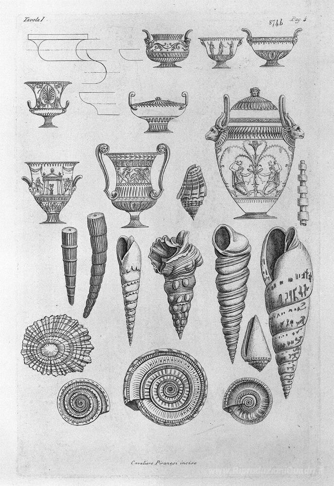 Ti offriamo una riproduzione artigianale su tela dell'opera famosa 'Contorno altre shell, e vasi greci inciso' di Giovanni Battista Piranesi, dal Museo delle Riproduzioni.