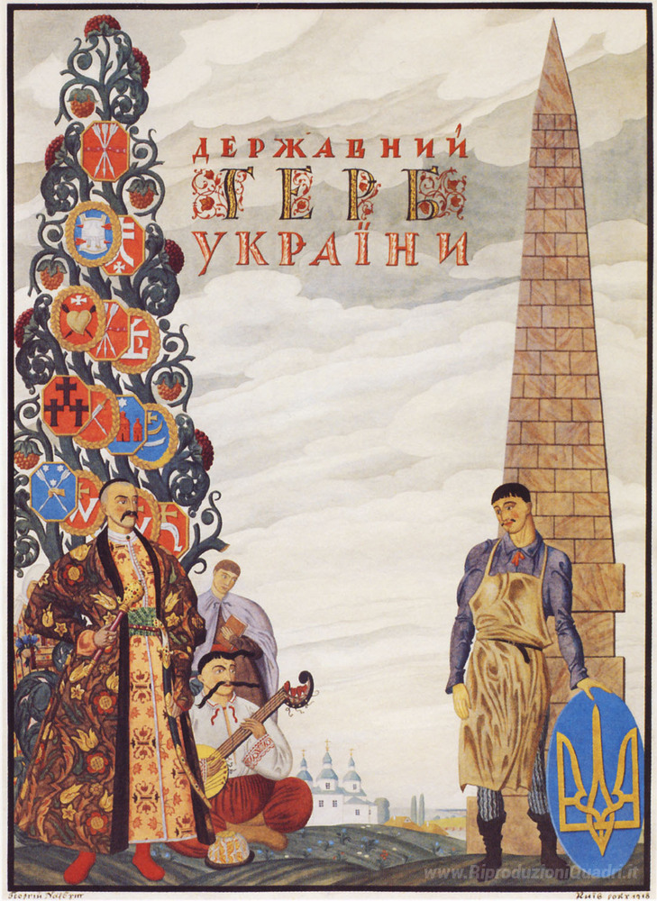 Ti offriamo una riproduzione artigianale su tela dell'opera famosa 'Copertina del progetto del grande stemma dello Stato ucraino' di Heorhiy Narbut, dal Museo delle Riproduzioni.
