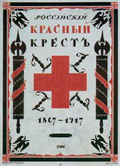 Ti offriamo una riproduzione artigianale su tela dell'opera famosa 'Copertina per il libro 'La Croce Rossa russa. 1867-1917. '' di Heorhiy Narbut, dal Museo delle Riproduzioni.