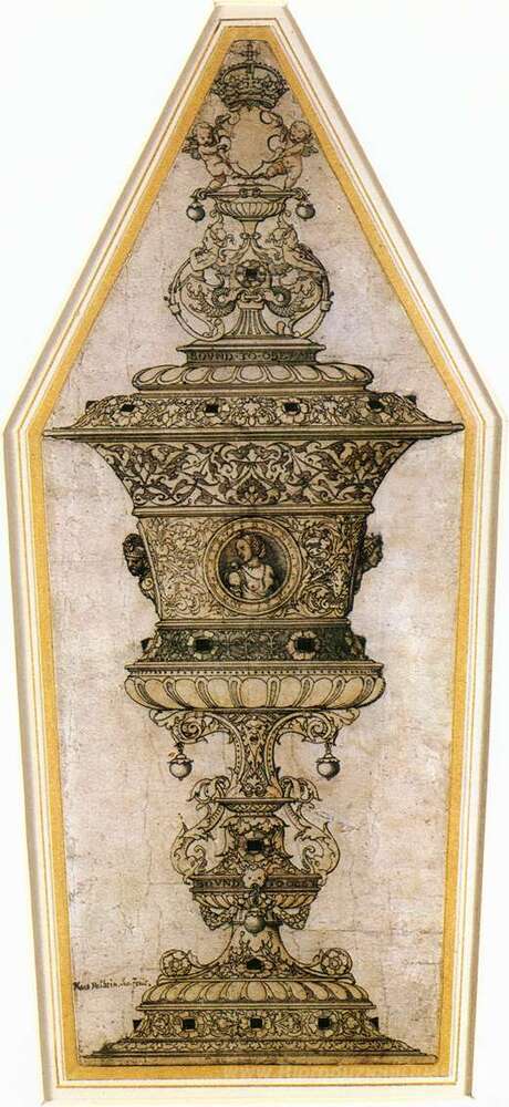 Ti offriamo una riproduzione artigianale su tela dell'opera famosa 'Coppa di Jane Seymour' di Hans Holbein the Younger, dal Museo delle Riproduzioni.