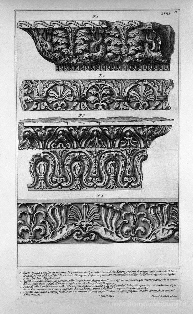 Ti offriamo una riproduzione artigianale su tela dell'opera famosa 'Cornici e grondaie' di Giovanni Battista Piranesi, dal Museo delle Riproduzioni.