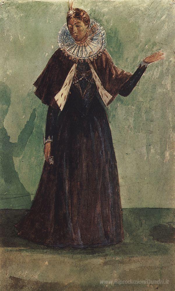 Ti offriamo una riproduzione artigianale su tela dell'opera famosa 'Costumi di Marina Mnishek alla tragedia di Puskin Boris Godunov' di Kuzma Petrov-Vodkin, dal Museo delle Riproduzioni.