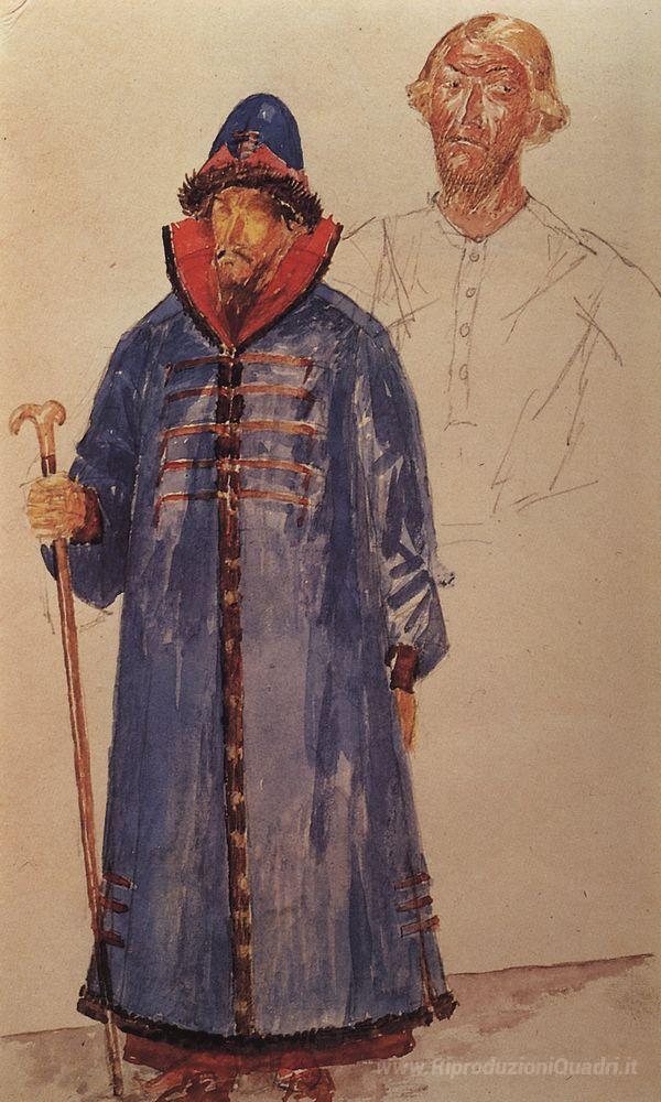 Ti offriamo una riproduzione artigianale su tela dell'opera famosa 'Costumi e make-up per la tragedia di Puskin Boris Godunov' di Kuzma Petrov-Vodkin, dal Museo delle Riproduzioni.