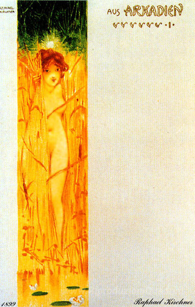 Ti offriamo una riproduzione artigianale su tela dell'opera famosa 'Da Arcadia' di Raphael Kirchner, dal Museo delle Riproduzioni.