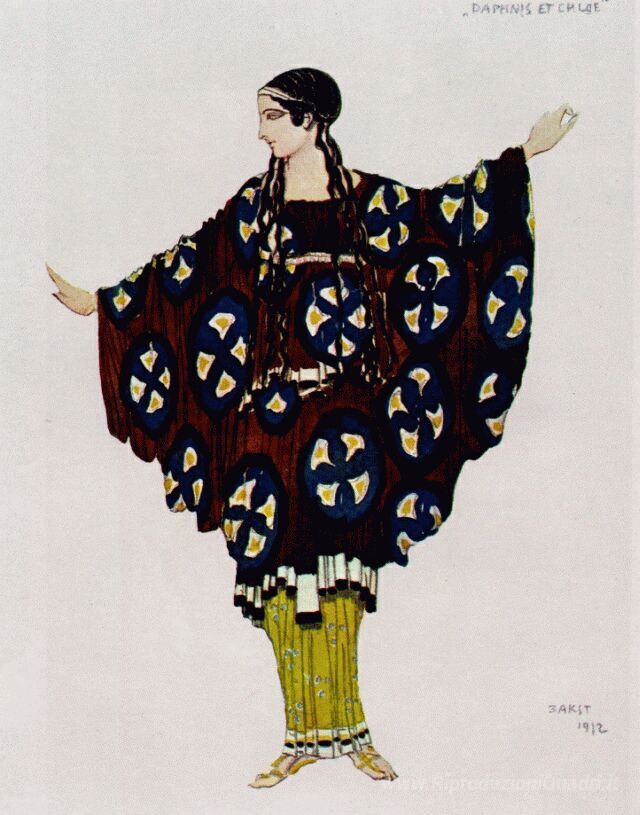 Ti offriamo una riproduzione artigianale su tela dell'opera famosa 'Dafni e Cloe costume' di Leon Bakst, dal Museo delle Riproduzioni.