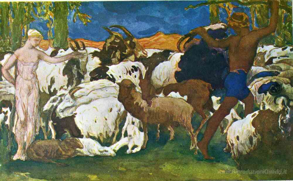 Benvenuti nel nostro prestigioso repertorio di dipinti a olio italiani, un viaggio attraverso l'eleganza e la raffinatezza delle opere d'arte. Oggi vi presentiamo Dafni e Cloe di fare offerte a vicenda buonanotte, un capolavoro del celebre artista Leon Bakst. Questo dipinto incarna l'essenza del romanticismo e della bellezza, trasformando ogni spazio in un oasi di armonia e grazia.