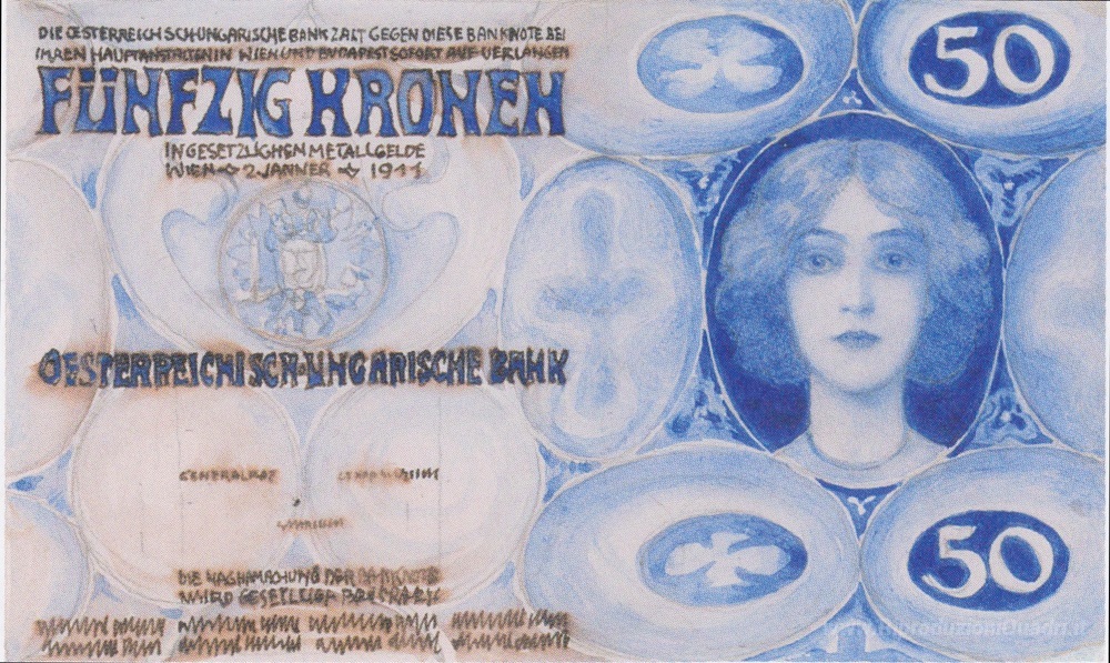 Ti offriamo una riproduzione artigianale su tela dell'opera famosa 'Design per il disegno di legge di 50 corone' di Koloman Moser, dal Museo delle Riproduzioni.
