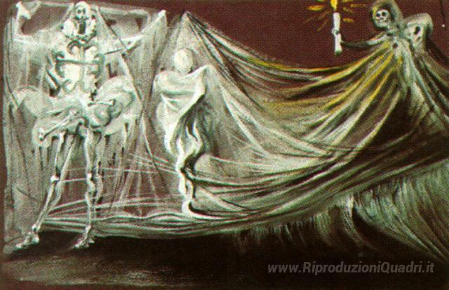 Ti offriamo una riproduzione artigianale su tela dell'opera famosa 'Design per la scena della morte di 'Don Giovanni Tenorio'' di Salvador Dali, dal Museo delle Riproduzioni.
