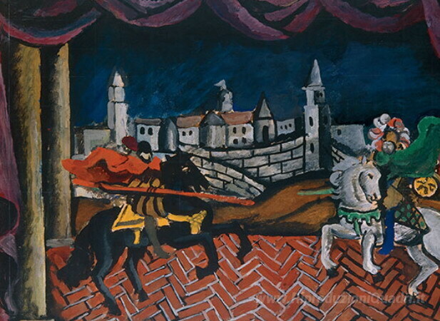 Ti offriamo una riproduzione artigianale su tela dell'opera famosa 'Design per l'opera di Wolfgang Amadeus Mozart, 'Don Giovanni'' di Pyotr Konchalovsky, dal Museo delle Riproduzioni.