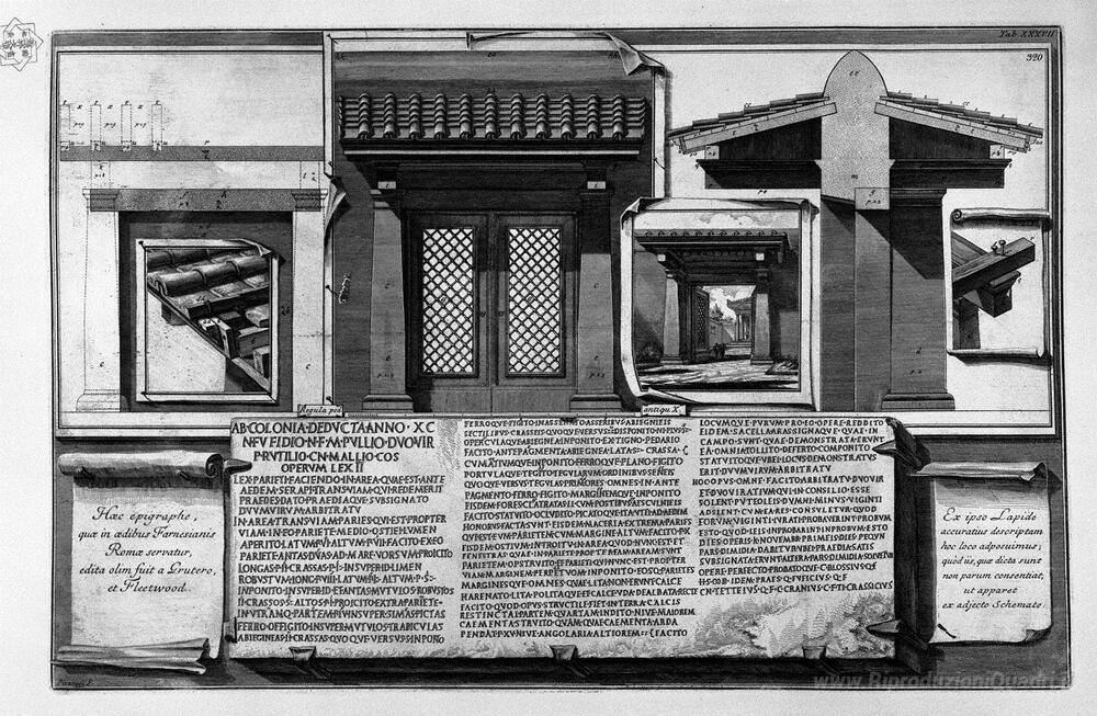 Ti offriamo una riproduzione artigianale su tela dell'opera famosa 'Dettagli costruttivi e un'iscrizione rinvenuta nei Giardini Farn' di Giovanni Battista Piranesi, dal Museo delle Riproduzioni.