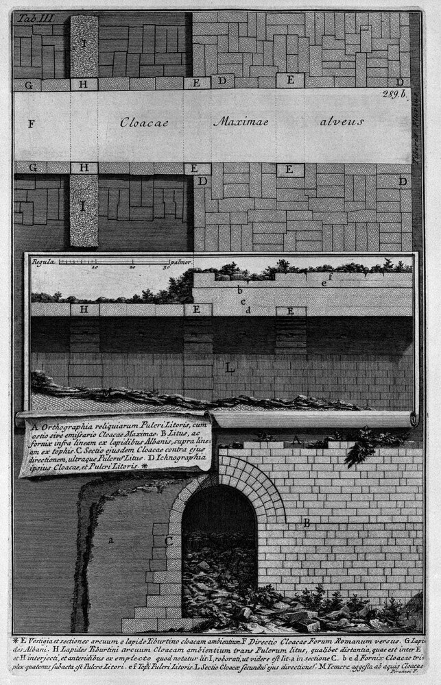 Ti offriamo una riproduzione artigianale su tela dell'opera famosa 'Dettagli di costruzione della Cloaca Massima' di Giovanni Battista Piranesi, dal Museo delle Riproduzioni.