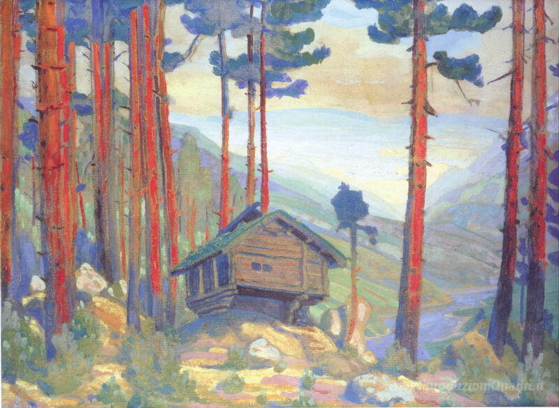 Ti offriamo una riproduzione artigianale su tela dell'opera famosa 'Di Solveig Song (Capanna nel bosco)' di Nicholas Roerich, dal Museo delle Riproduzioni.