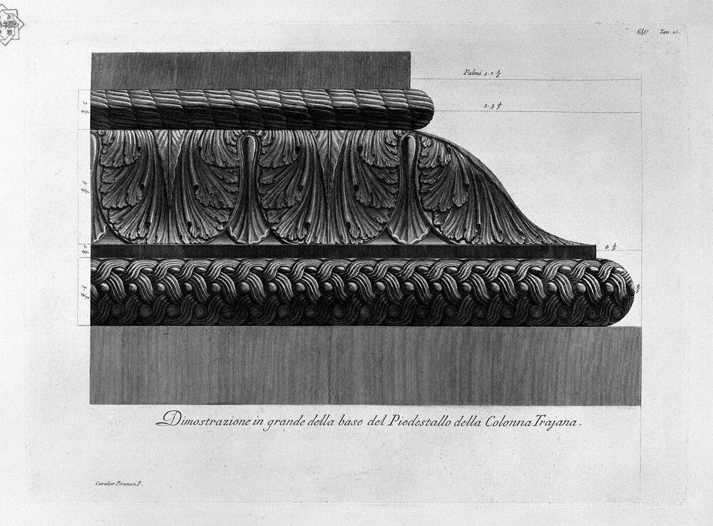 Ti offriamo una riproduzione artigianale su tela dell'opera famosa 'Dimostrazione di una grande base piedistallo della colonna Traja' di Giovanni Battista Piranesi, dal Museo delle Riproduzioni.