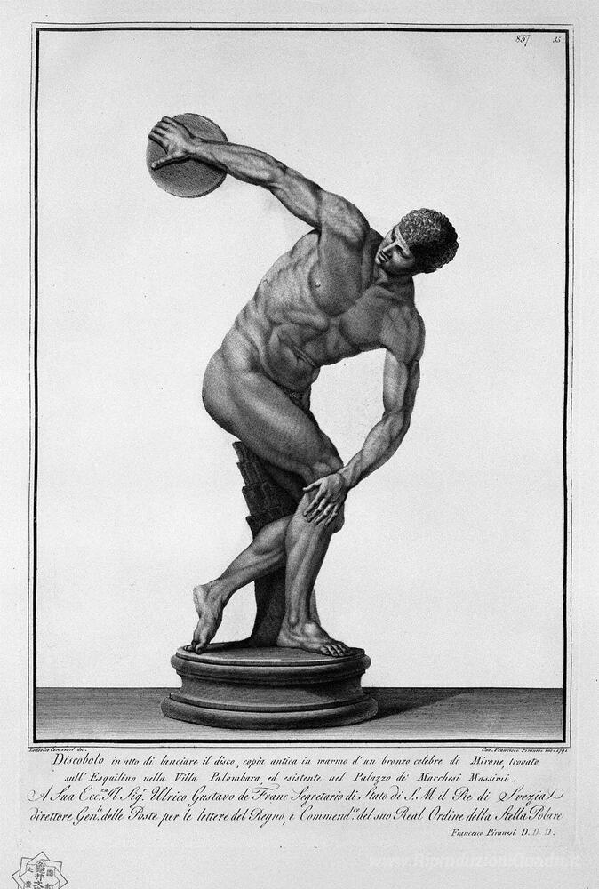 Ti offriamo una riproduzione artigianale su tela dell'opera famosa 'Discobolo' di Giovanni Battista Piranesi, dal Museo delle Riproduzioni.