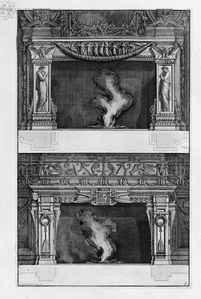Ti offriamo una riproduzione artigianale su tela dell'opera famosa 'Due camini sovrapposte: il auletridi supporto con due lati, e nu' di Giovanni Battista Piranesi, dal Museo delle Riproduzioni.