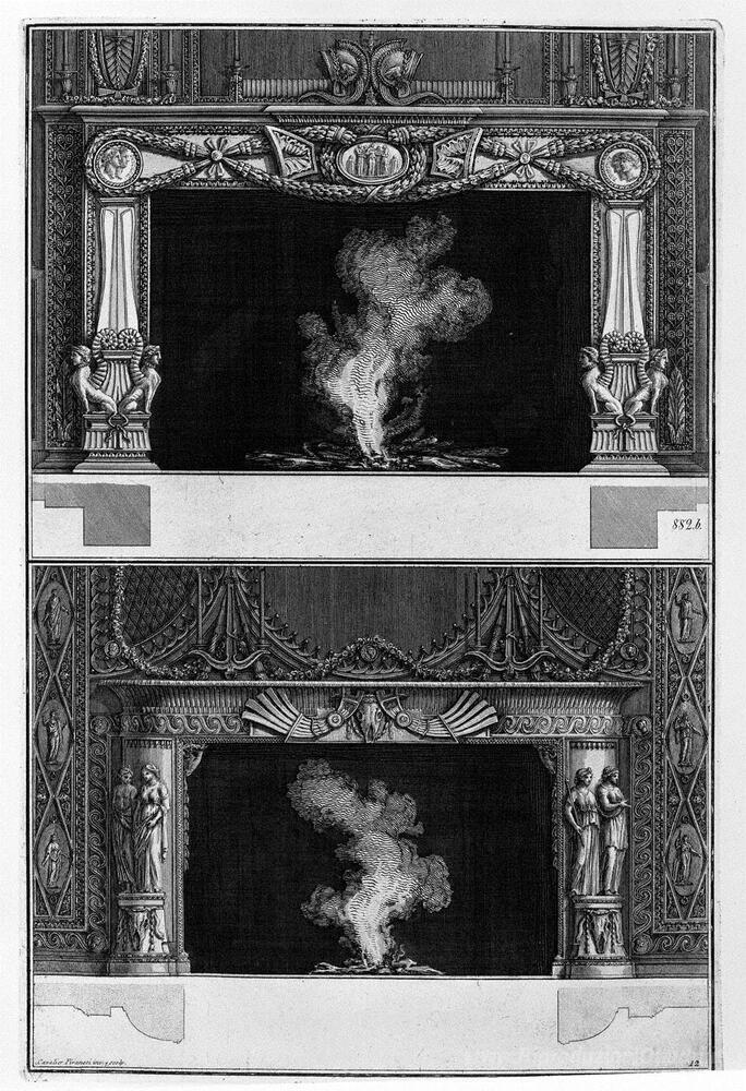 Ti offriamo una riproduzione artigianale su tela dell'opera famosa 'Due camini sovrapposti con i cammei di supporto e sfingi in freg' di Giovanni Battista Piranesi, dal Museo delle Riproduzioni.