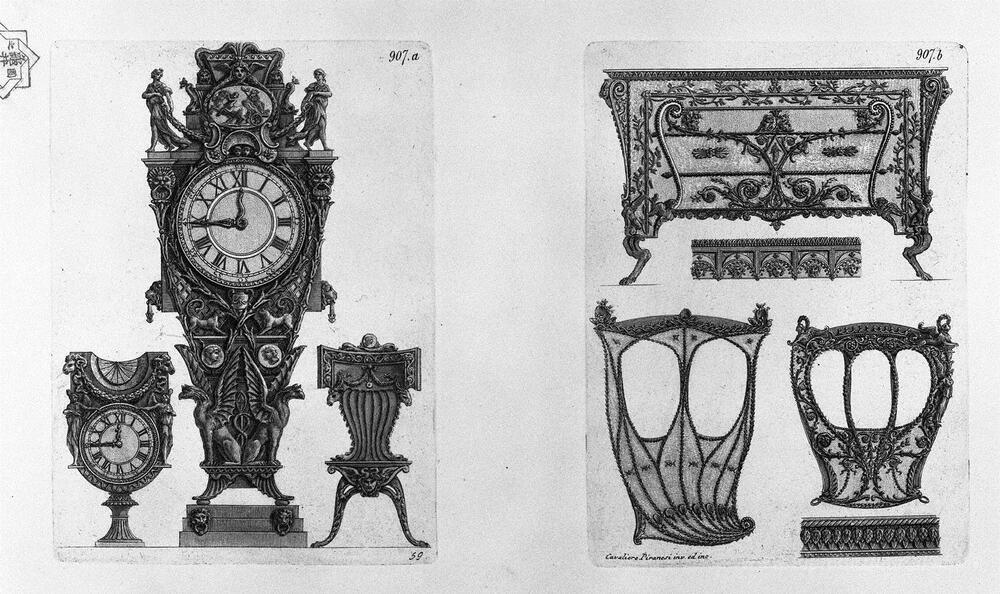 Ti offriamo una riproduzione artigianale su tela dell'opera famosa 'Due orologi e una sedia Due lati della berlina, e una cassa' di Giovanni Battista Piranesi, dal Museo delle Riproduzioni.
