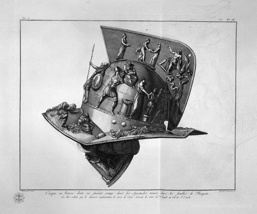 Ti offriamo una riproduzione artigianale su tela dell'opera famosa 'Elmo e il gladiatore di bronzo' di Giovanni Battista Piranesi, dal Museo delle Riproduzioni.