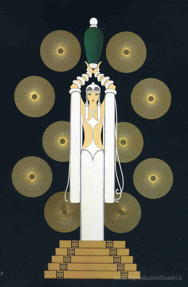 Ti offriamo una riproduzione artigianale su tela dell'opera famosa 'Emerald Vase' di Erte, dal Museo delle Riproduzioni.