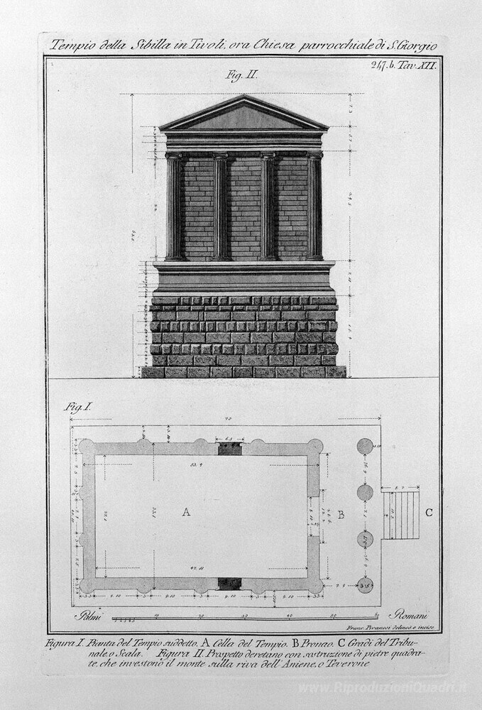 Ti offriamo una riproduzione artigianale su tela dell'opera famosa 'Facciata e il lato del Tempio della Sibilla a Tivoli' di Giovanni Battista Piranesi, dal Museo delle Riproduzioni.