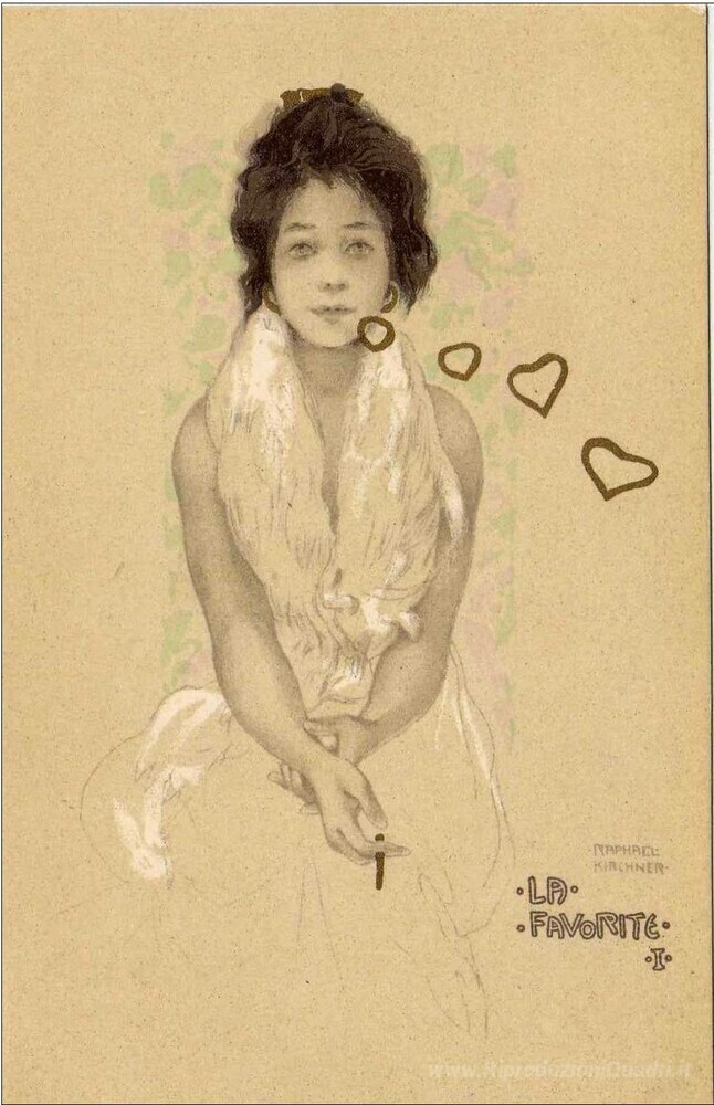 Ti offriamo una riproduzione artigianale su tela dell'opera famosa 'Favorito' di Raphael Kirchner, dal Museo delle Riproduzioni.