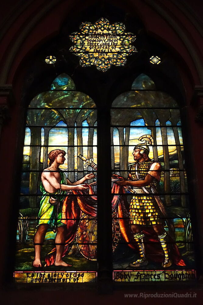 Ti offriamo una riproduzione artigianale su tela dell'opera famosa 'Finestre - Chiesa del Patto (Boston)' di Louis Comfort Tiffany, dal Museo delle Riproduzioni.