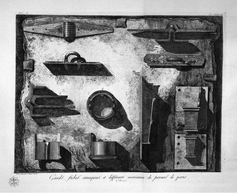 Ti offriamo una riproduzione artigianale su tela dell'opera famosa 'Fissaggi trovato a Pompei' di Giovanni Battista Piranesi, dal Museo delle Riproduzioni.
