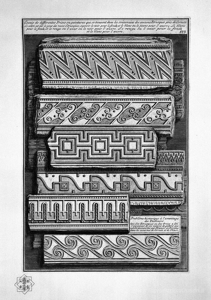 Ti offriamo una riproduzione artigianale su tela dell'opera famosa 'Fregi di tombe etrusche di Tarquinia' di Giovanni Battista Piranesi, dal Museo delle Riproduzioni.