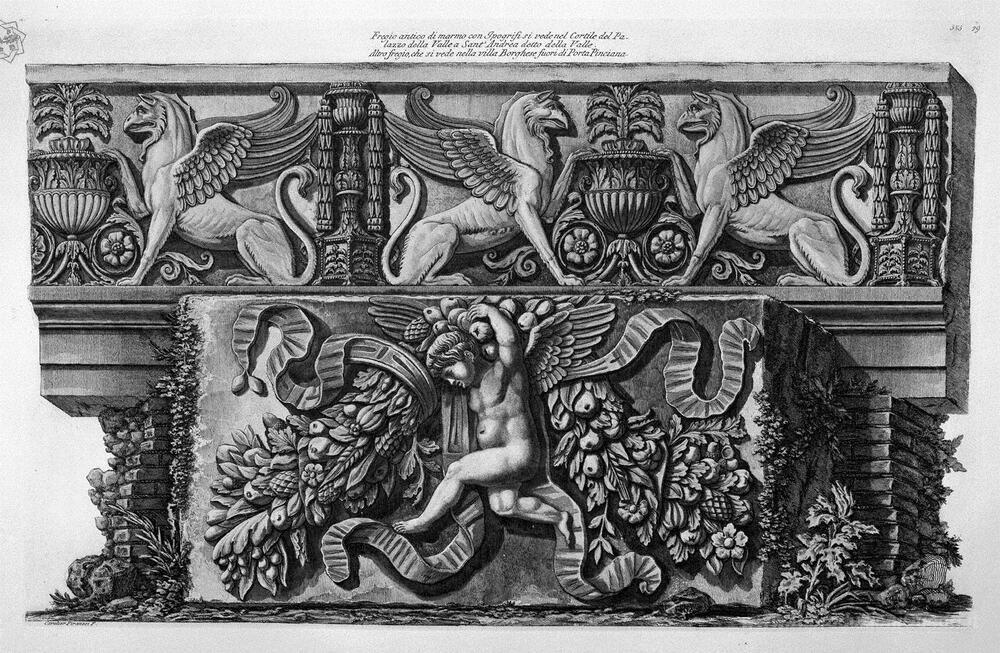 Ti offriamo una riproduzione artigianale su tela dell'opera famosa 'Fregio Ippogrifi marmo antico nel cortile del palazzo della Vall' di Giovanni Battista Piranesi, dal Museo delle Riproduzioni.