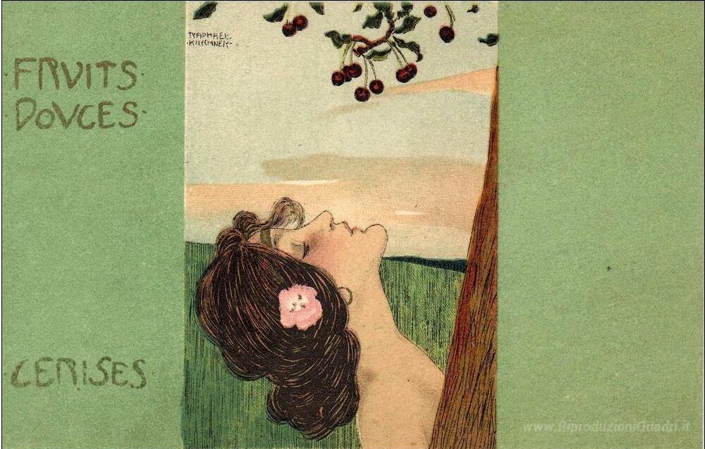 Ti offriamo una riproduzione artigianale su tela dell'opera famosa 'Frutta dolce' di Raphael Kirchner, dal Museo delle Riproduzioni.