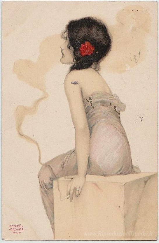 Ti offriamo una riproduzione artigianale su tela dell'opera famosa 'Fumatori Donne' di Raphael Kirchner, dal Museo delle Riproduzioni.