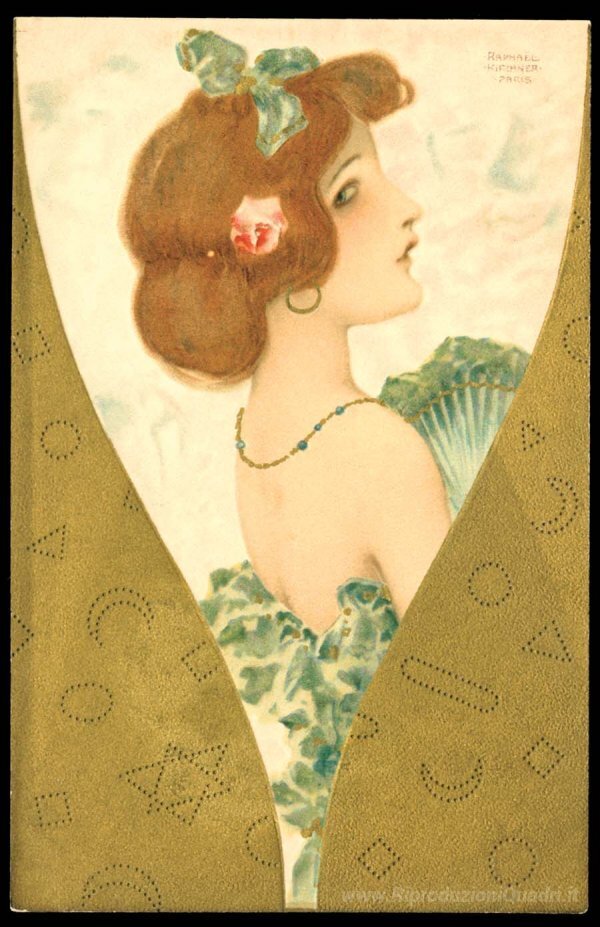 Ti offriamo una riproduzione artigianale su tela dell'opera famosa 'Gioielli' di Raphael Kirchner, dal Museo delle Riproduzioni.