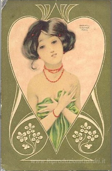 Ti offriamo una riproduzione artigianale su tela dell'opera famosa 'Gioielli' di Raphael Kirchner, dal Museo delle Riproduzioni.