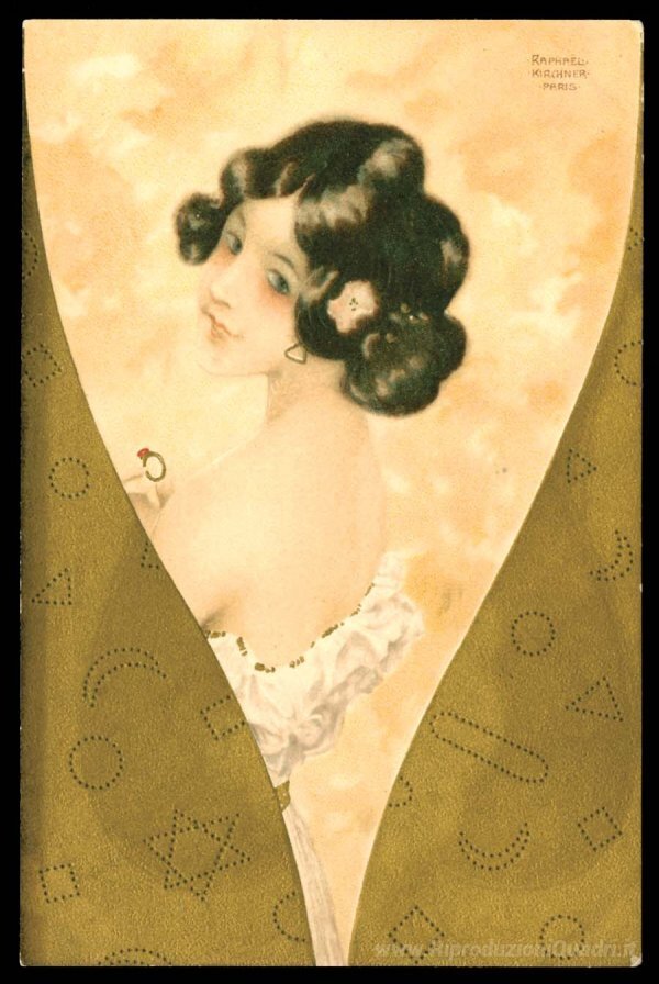 Ti offriamo una riproduzione artigianale su tela dell'opera famosa 'Gioielli' di Raphael Kirchner, dal Museo delle Riproduzioni.