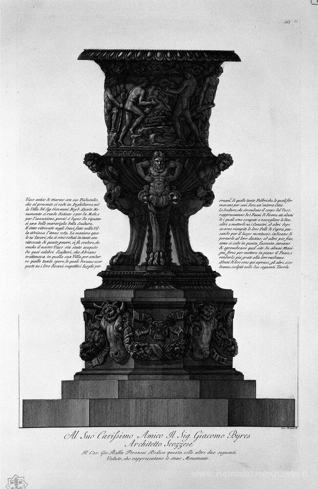 Ti offriamo una riproduzione artigianale su tela dell'opera famosa 'Grande vaso antico con il suo piedistallo di marmo trovato a Had' di Giovanni Battista Piranesi, dal Museo delle Riproduzioni.
