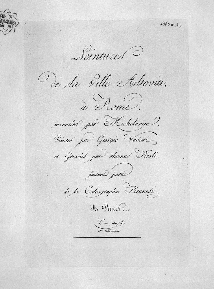 Ti offriamo una riproduzione artigianale su tela dell'opera famosa 'Il frontespizio recante la scritta de Dipinti la Villa Altoviti ' di Giovanni Battista Piranesi, dal Museo delle Riproduzioni.