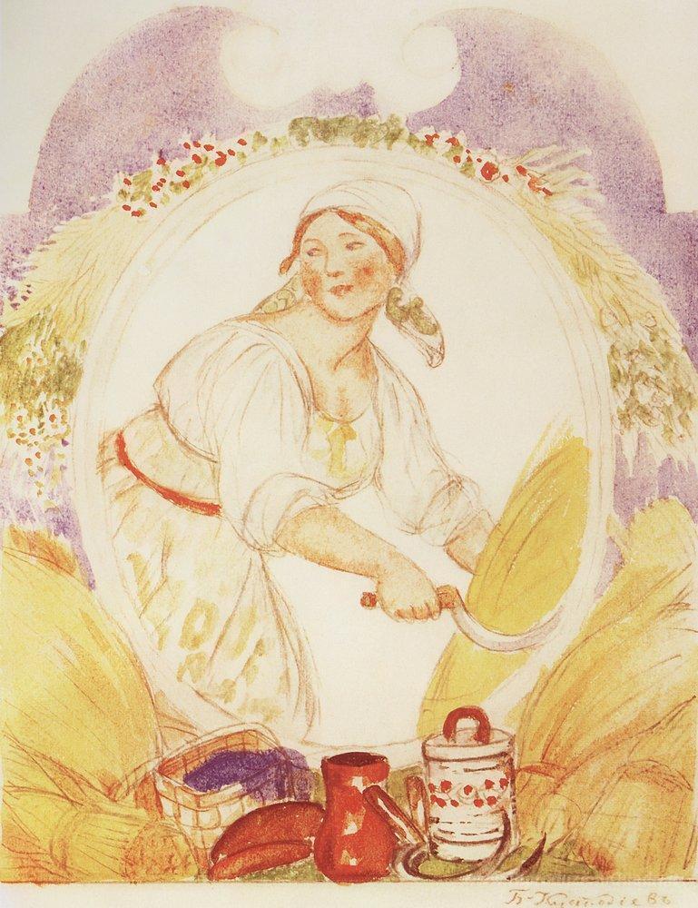 Ti offriamo una riproduzione artigianale su tela dell'opera famosa 'Il Mietitore, studio per la decorazione del Ruzheinaya (Rifle) P' di Boris Kustodiev, dal Museo delle Riproduzioni.