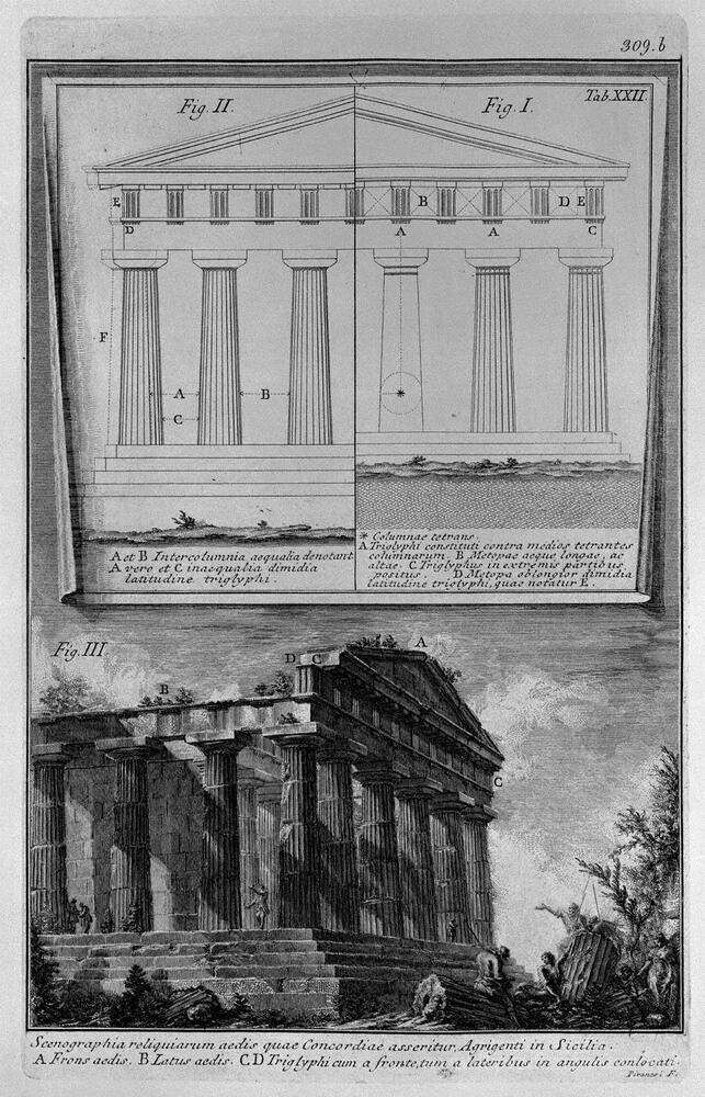 Ti offriamo una riproduzione artigianale su tela dell'opera famosa 'Impostare quote di progetto e il Tempio della Concordia di Agrig' di Giovanni Battista Piranesi, dal Museo delle Riproduzioni.