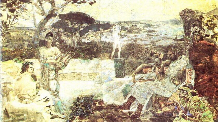 Ti offriamo una riproduzione artigianale su tela dell'opera famosa 'Italia. Scene di vita antica. (Bozzetto per il sipario in russo ' di Mikhail Vrubel, dal Museo delle Riproduzioni.