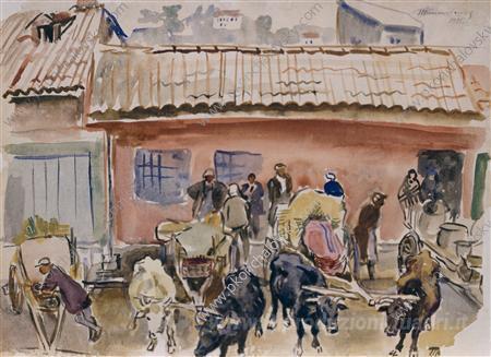 Benvenuti nel mondo incantevole dell'arte a olio, dove ogni opera racconta una storia unica e affascinante. Tra queste, spicca Kutaisi. Mercato dell'uva, un capolavoro dell'artista russo-italiano Pyotr Konchalovsky. Nato nel 1876, Konchalovsky ha saputo amalgamare le influenze della pittura russa con le tecniche e le luminosità italiane, creando opere che riflettono la sua profonda passione per la vita e la natura.
