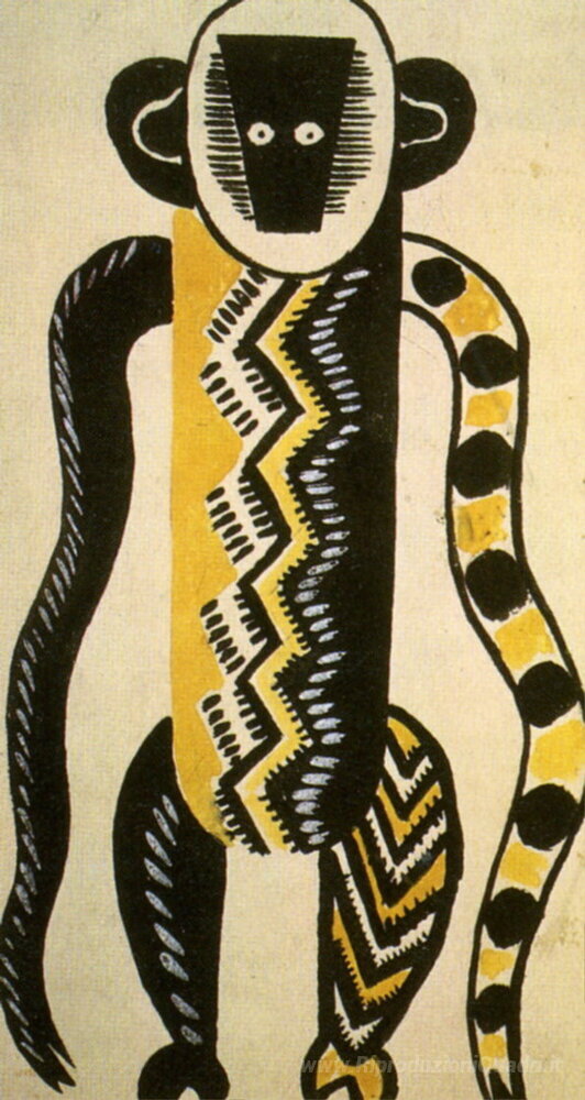 Ti offriamo una riproduzione artigianale su tela dell'opera famosa 'La creazione del disegno mondiale scimmia del costume' di Fernand Leger, dal Museo delle Riproduzioni.