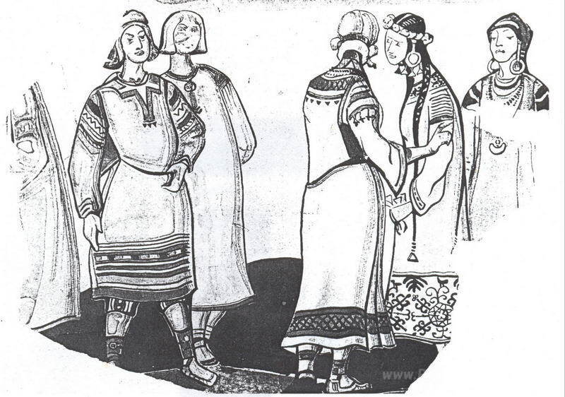 Ti offriamo una riproduzione artigianale su tela dell'opera famosa 'La scena con cinque figure in costume' di Nicholas Roerich, dal Museo delle Riproduzioni.