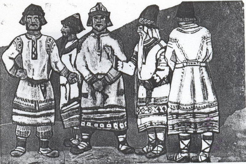 Ti offriamo una riproduzione artigianale su tela dell'opera famosa 'La scena con cinque figure in costume' di Nicholas Roerich, dal Museo delle Riproduzioni.