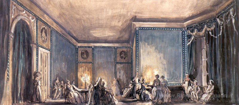 Ti offriamo una riproduzione artigianale su tela dell'opera famosa 'La scena della palla. Set design per l'opera di Tchaikovsky "reg' di Alexandre Benois, dal Museo delle Riproduzioni.