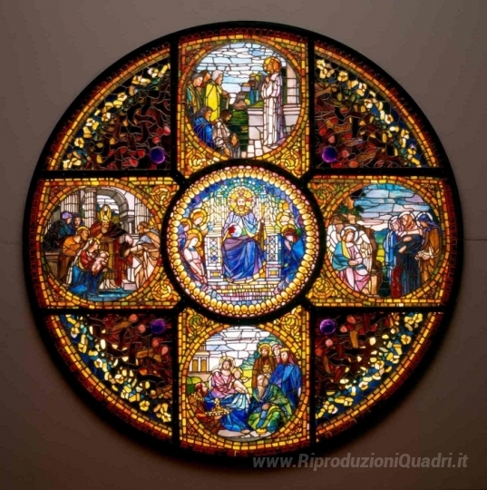 Ti offriamo una riproduzione artigianale su tela dell'opera famosa 'La storia della finestra Croce' di Louis Comfort Tiffany, dal Museo delle Riproduzioni.